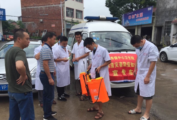 工作人员一方面上门入户发放灾后传染病防控知识宣传单、普及防疫知识,为群众答疑解问,增强群众灾后健康防疫意识和防病能力;另一方面对被污染的水井、被淹的房屋、广场、屋场等公共场所进行消杀,给受灾村民发放消毒药品,指导受灾村民对自家进行消毒。
