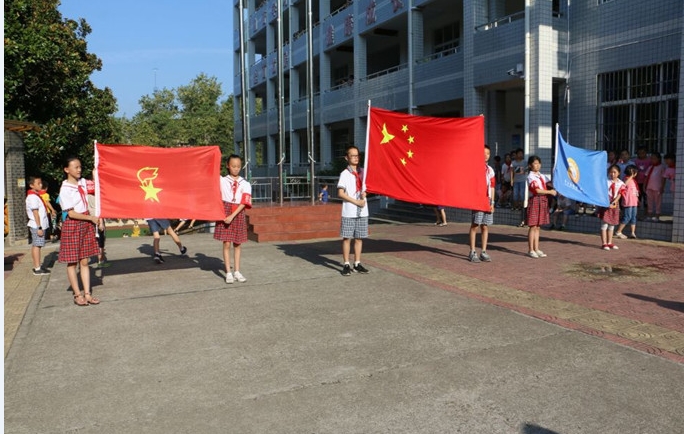 当孩子们缓缓走过入学门,高年级代表主持入学礼正式开始。大队辅导员缪丹老师先告诉大家:“童蒙之学,始于衣冠;先正衣冠,后明事理”,鼓励他们“做一个知书知礼的阳光少年。”要“以自身的努力,为梦想插上腾飞的翅膀”。随后,缪丹带领大家认识国旗、队旗和校旗,然后由高年级学生将它们随国歌、队歌、校歌冉冉升起。