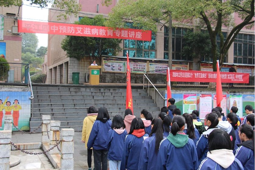 艾滋病严重威胁着每一个人和每一个家庭,预防艾滋病是全社会的共同责任。12月24日,周一“国旗下讲话”时段,平江四中校园里迎来了一群“白大褂”,他们是来自县第五人民医院公共卫生科工作人员,专程来校宣传普及预防艾滋病知识,宣讲第31个“世界艾滋日”主题,倡导文明健康生活方式。
