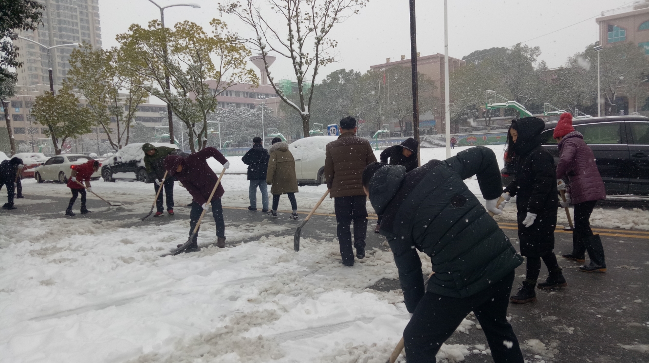 上午10点多,一支由校务成员、政教处人员、共产党员及部分教师组成的除雪铲冰突击队出现在校园主干道及校门处。他们手握铁锹,顶风冒雪,集中铲除校门口、主干道及家属楼、教学区主要进出通道积雪,奋不顾身地连续劳作二个多小时,汗水与雪水沁湿了他们的衣背仍在坚持。“我们4栋退休老师集中居住在这里,我虽然身体也不好,但为了老教师们的出行安全,算上我一个!”年过五旬的女教师熊立武也自觉加入了这支队伍。