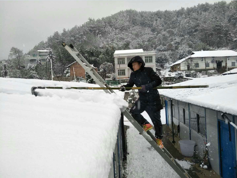中午时分,群里出现了一张与欢乐不协调的照片——本地一家酸菜厂的板房被雪压倒了。建设中的十二中有十二个教室的板房,雪还在继续,我们的板房安全吗?不用讨论,离校最近的吴坚老师叫上门卫何友保师傅立即搬着梯子,上屋扒耙积雪。离校不远的多位老师也迅速赶到学校,加入抢险战斗系列。
