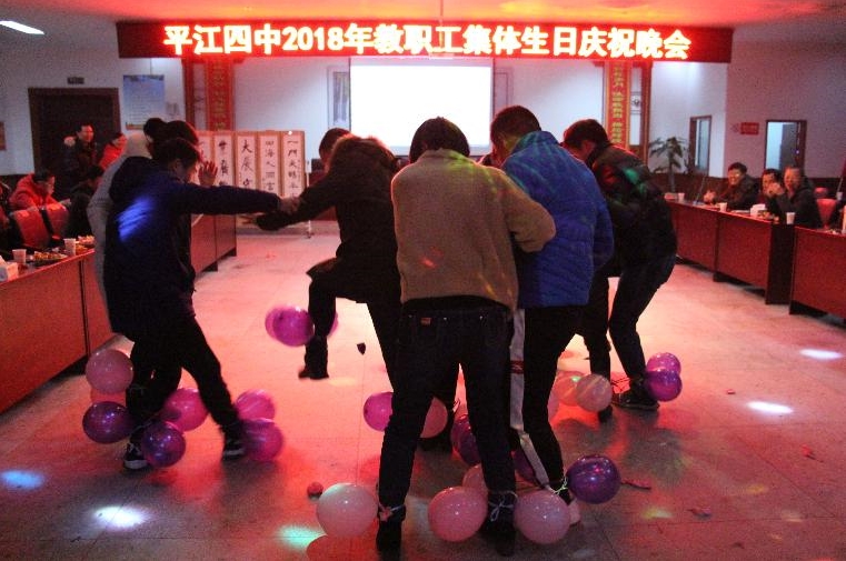 为充分调动大家参与热情,营造热烈喜庆氛围,组织方安排了歌舞类、表演类、游戏类、竞猜类四大活动。活动内容丰富多彩,节目高雅文明,教工积极参与,现场欢声笑语飞溅,掌声连连。李注海、熊荣荣老师深情献唱了《留什么给你》《前门情思大碗茶》,邹旭兵老师现场表演了太极拳陈式十三式,刘自谋、何跨海两位老师现场撰联并书写“一门天赐平安福,四海人同富贵春”等对联,王强等4人萨克斯、葫芦丝器乐组合,为大家演奏了美妙的《牧羊曲》《生日快乐歌》。在“踩气球”游戏环节,规定 10人5组男女绑腿搭配,左右脚各捆绑三个气球,在活动开始后互相踩对方的气球,哪组破得最少则胜出,结果第一组胜出。随后,步入了紧张而长见识的微信解答“猜谜语、知识抢答”比赛环节。各科目老师大显身手的时候到了,年轻人以反应迅速、知识前端而一路领先。晚会在教职工分享生日大蛋糕中愉快结束。