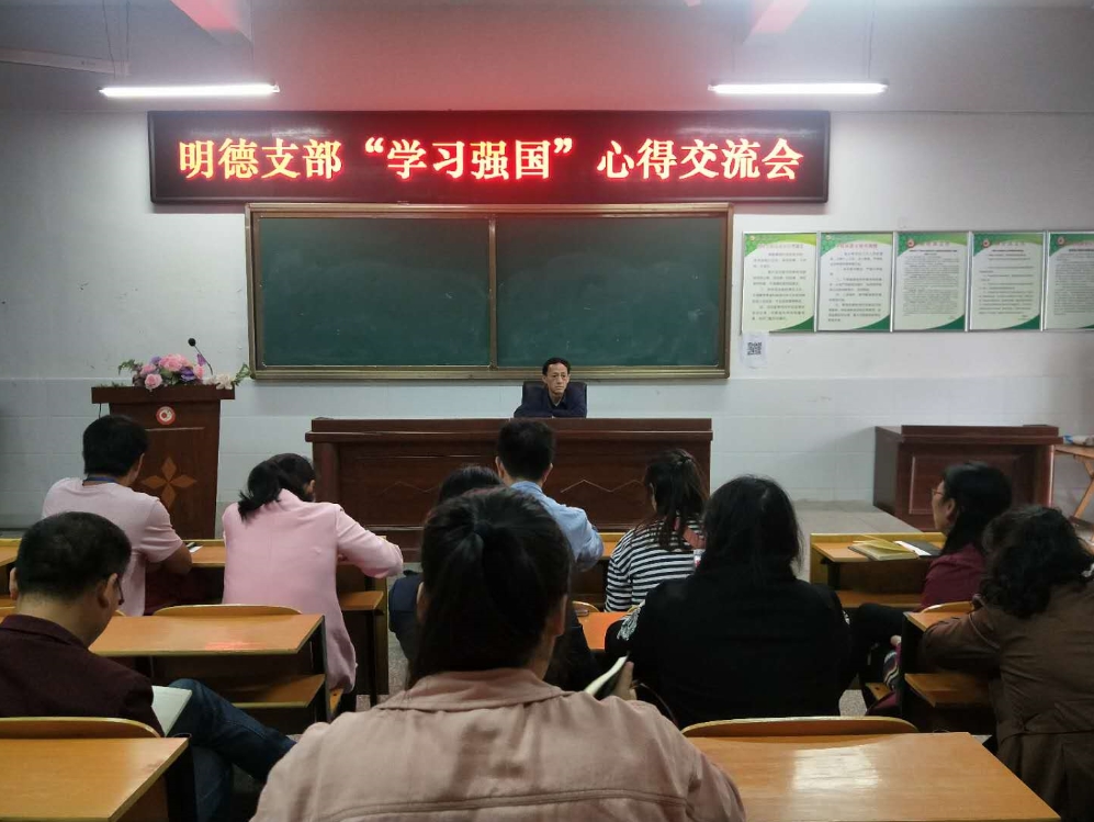 4月28日,三阳明德学校电教室里一位接一位的党员轮流上台分享“学习强国”心得体会,诉说着对党的句句真话。