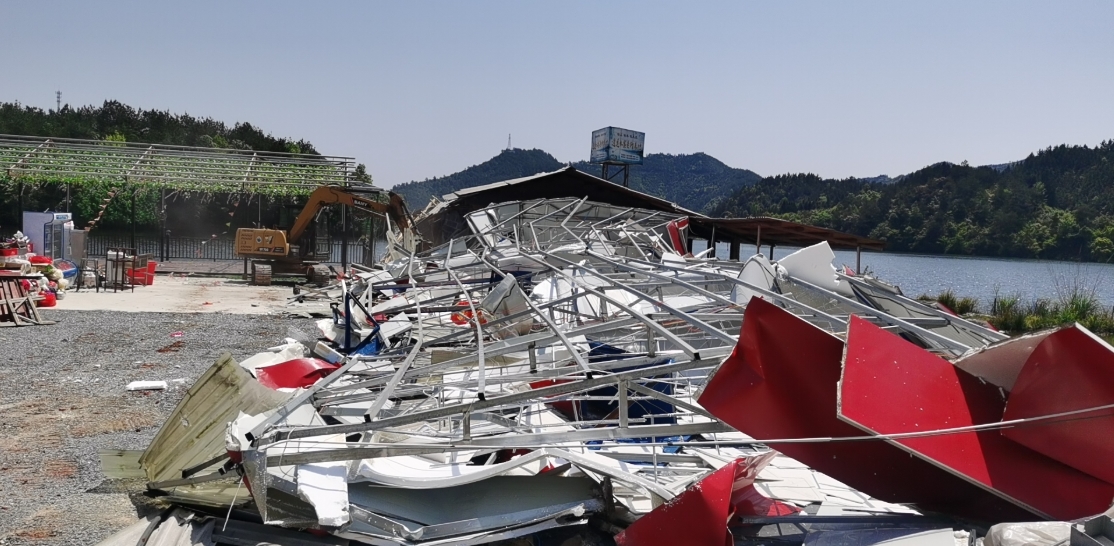 4月15日,三阳乡联合县河长制综合执法大队、自然资源局执法大队、水利局执法大队,组织城乡建设与自然资源联合办公室、国土所、应急大队、水管站、派出所、当地支村委等单位,对万古村水上违章建筑逍遥水寨进行依法拆除,共计拆除建筑面积1000余平米。