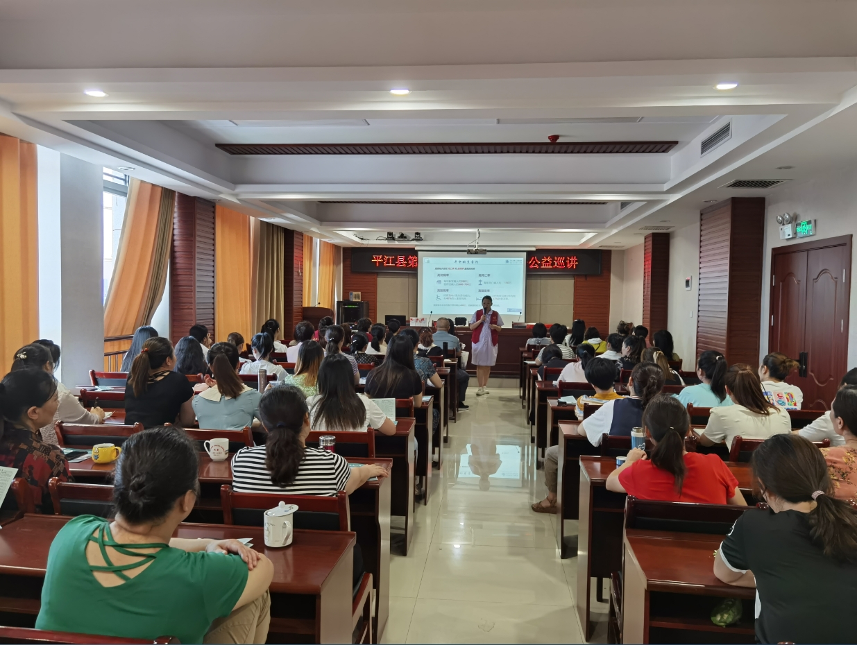 7月9日,岳阳市芙蓉公益大讲堂平江专场、“健康平江你我同行”县第一人民医院健康科普公益巡讲在天岳街道四楼大会议室开讲,街道机关、各村(社区)女职工共100余人参加。