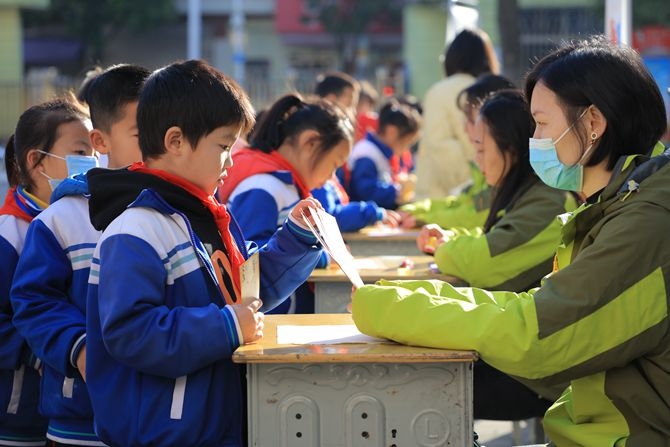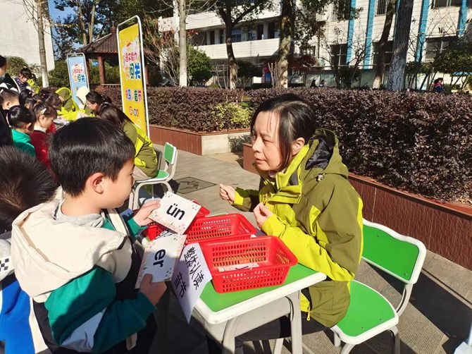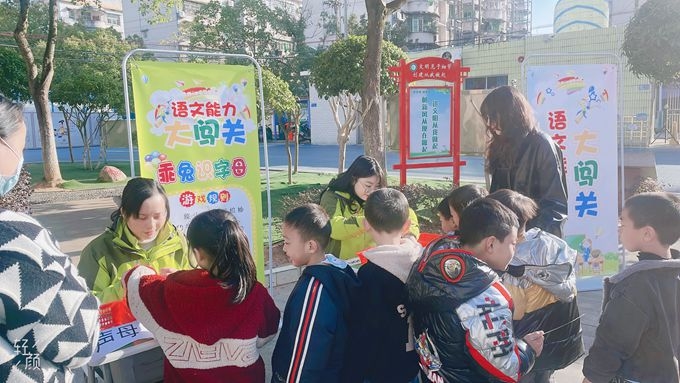 “来,看看我的识字奖章!”“耶,我获得了五个章,我闯关成功啦!”11月25日至26日,冬日暖阳下,整个新城校园博文楼前的和谐小广场正是热闹非凡时,该校一二年级组的小朋友们像一只只快乐的小鸟徜徉在游戏乐园里。