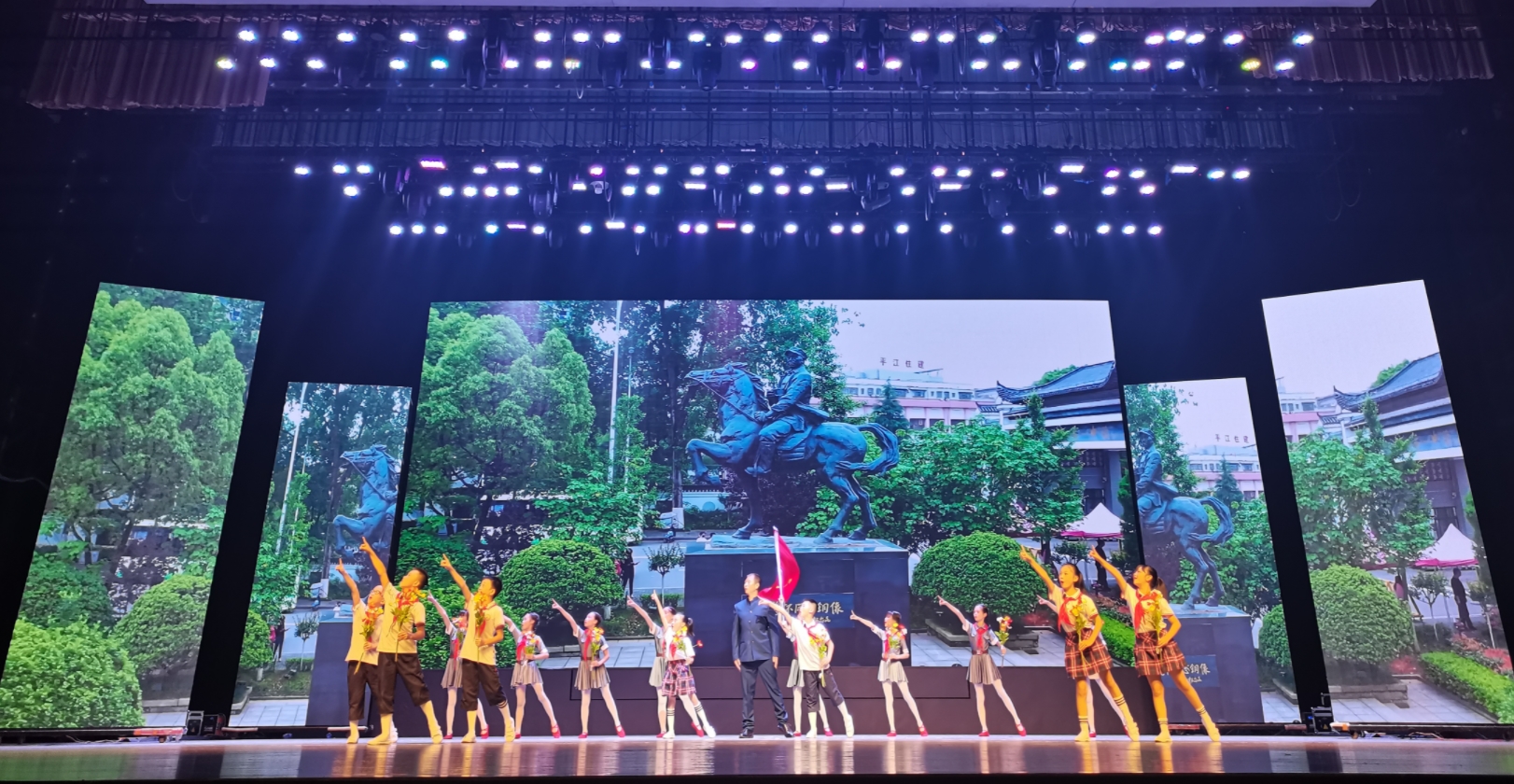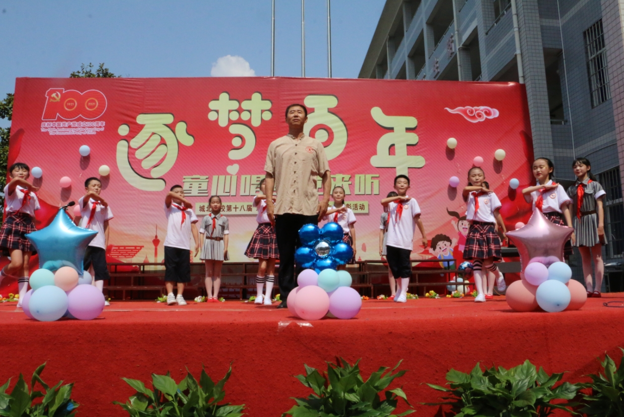 去年,城北学校精心排练原创节目《我们跟爷爷看铜像》,为中国共产党的百岁华诞献礼。该节目剧本由平江县文化馆李纯老师创作,资深音乐教师郭雄辉为剧本量身打造出三首曲目。节目以“红色革命根据地”为背景,生动再现了“平江起义”那一段光荣党史,讴歌了彭德怀元帅和为革命胜利作出牺牲的英雄儿女,指引着孩子们幸福地去奋斗。