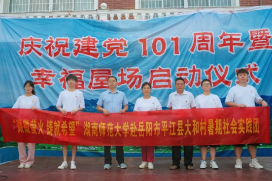 6月27日,由大和村党支部主办,湖南师范大学、中南林业科技大学协办的庆祝建党101周年暨“幸福屋场打造”启动仪式于大和村正式启动。福寿山镇副镇长彭台甫、湖南师范大学旅游学院研究生导师汤静教授参加本次仪式,大和村支村两委全体成员、大和村在家党员以及来自湖南师范大学的“微微萤火,铸就希望”暑期社会实践团、中南林业科技大学的青年志愿者参加。