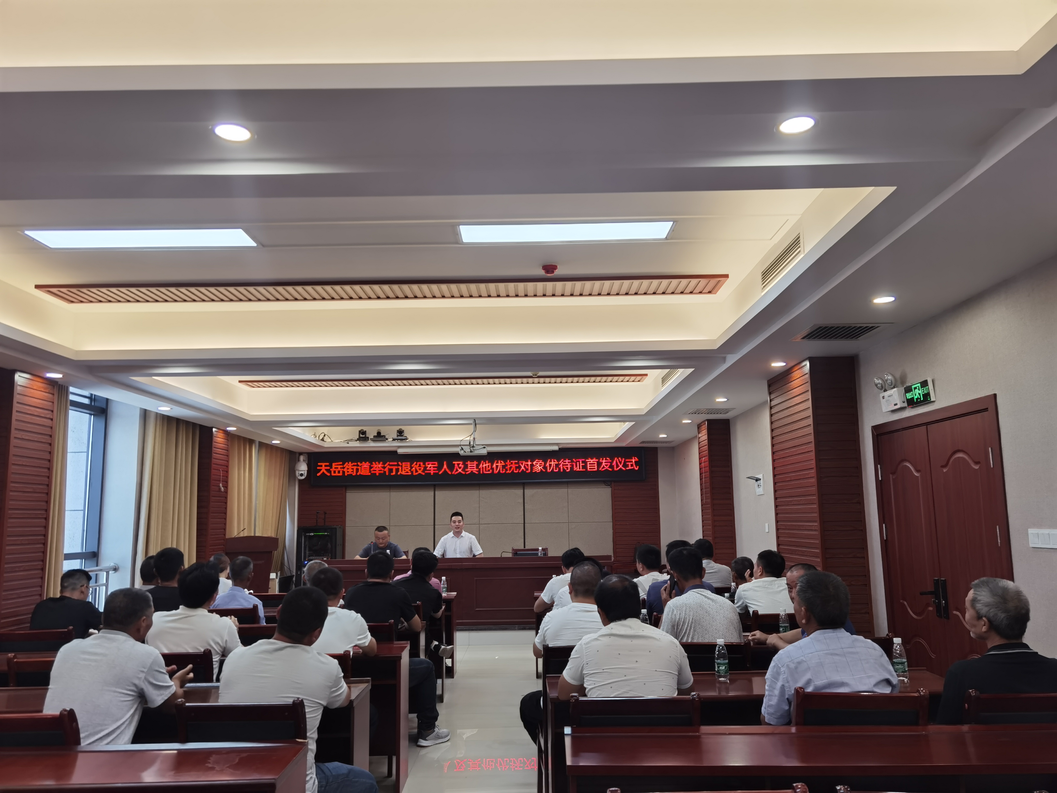 首发仪式上,天岳街道党工委委员叶泽望为退役军人代表逐一颁发退役军人优待证,并通过他们向广大退役军人及其他优抚对象表示衷心的祝福,要求退役军人服务站要加快推进落实优待证申领制证工作,让辖区内每一名退伍军人都尽快拿到优待证,享受优待待遇。