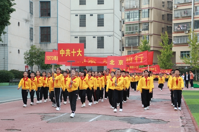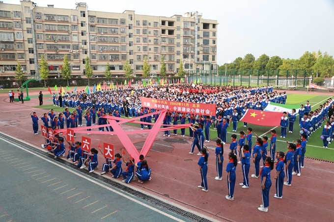 童心向党乐成长,五育并举向未来。10月26日,新城学校第十届“阳光新城”体育节拉开了帷幕。该校四、五年级22个班级分别举着由中共一大到二十大命名的展示牌,用方阵回顾建党百年奋斗历程,宣传党史知识,表达对党的热爱。