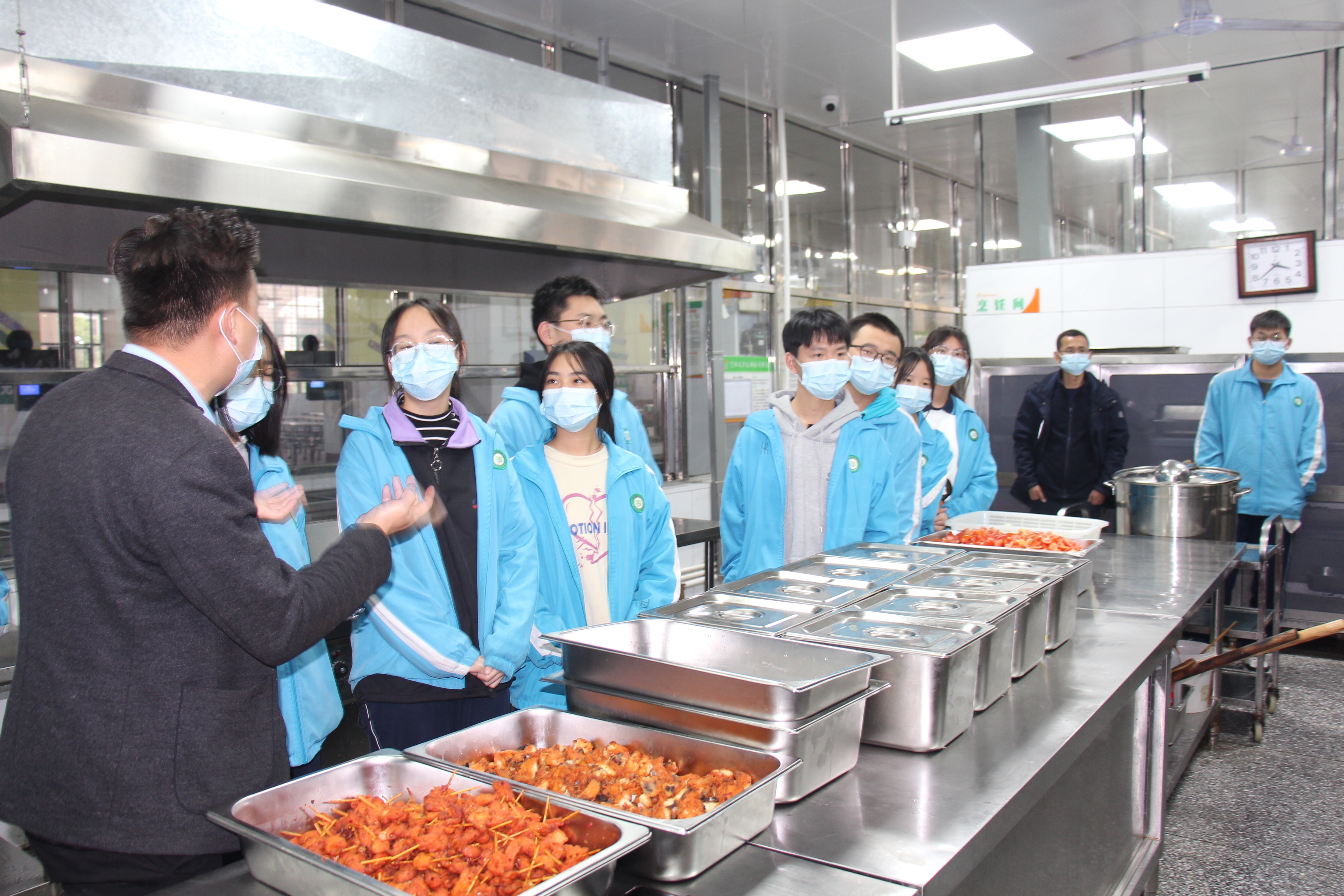 在操作间,食堂工作人员按照相关规定统一着装,戴着头套、口罩紧张忙碌地工作着。餐车上整齐地摆放着蒜苗炒香肠、芋头蒸排骨、青椒炒鸡肉豆腐、腊八豆炒鸡蛋、清炒藕片等成品,色香味俱全,二楼师傅们正在制作特色套餐和面点小吃,更是令同学们眼界大开。