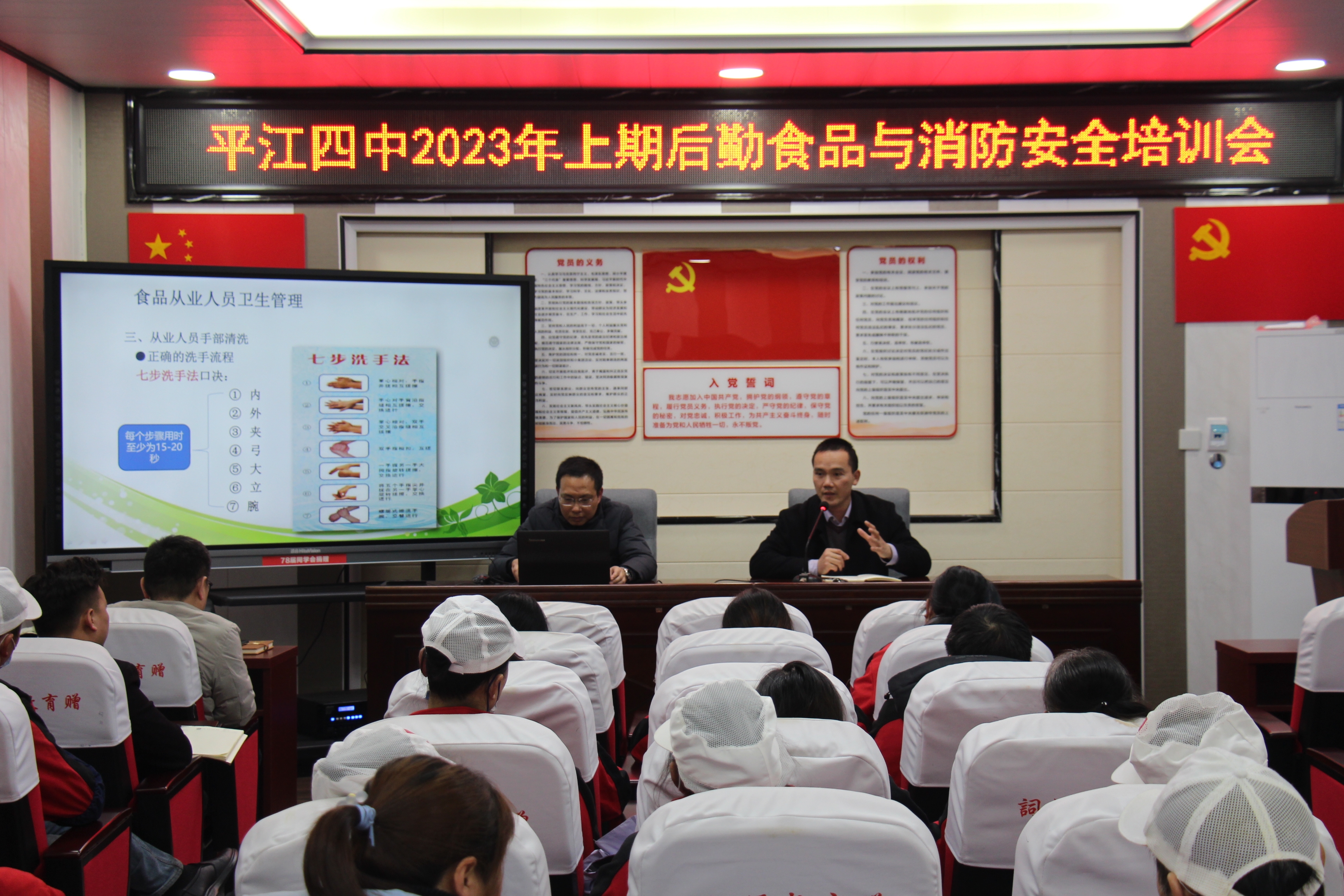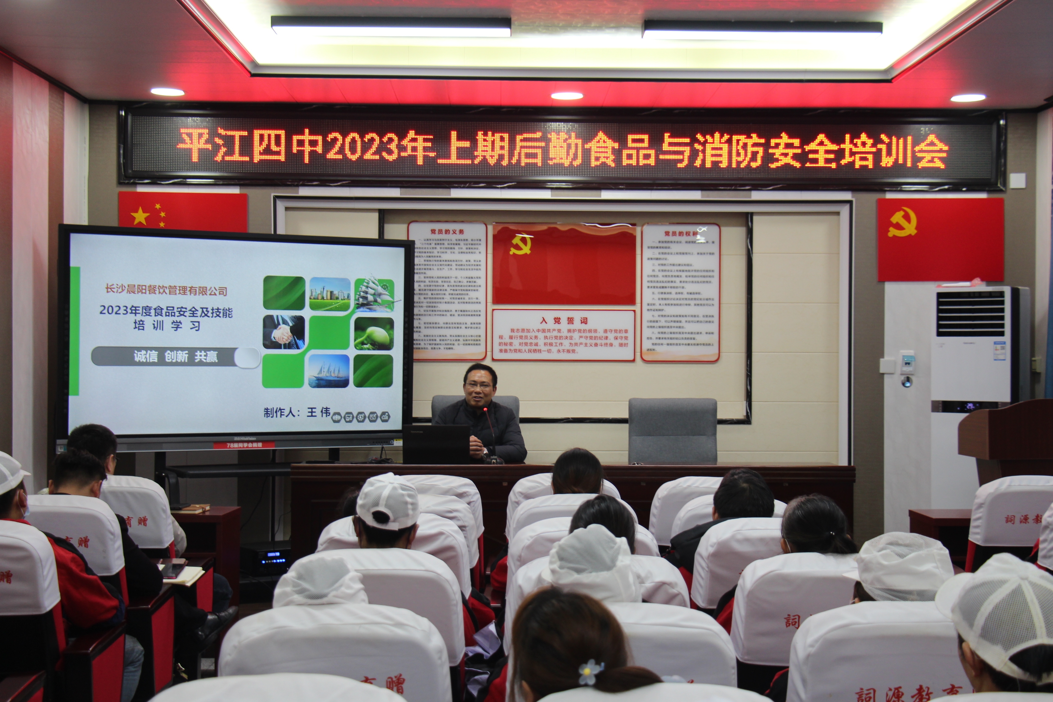 兵马未动,粮草先行。为进一步提高学校后勤服务管理质量,提升全体后勤人员的优质服务、安全操作意识,保障教育教学工作有序开展,2月12日中午,平江四中举行了后勤食品安全暨消防安全员工培训会。50余名食堂员工、校园商店营业员及全体后勤人员参加了会议,进一步压实新学期后勤线主体安全责任与岗位担当意识。