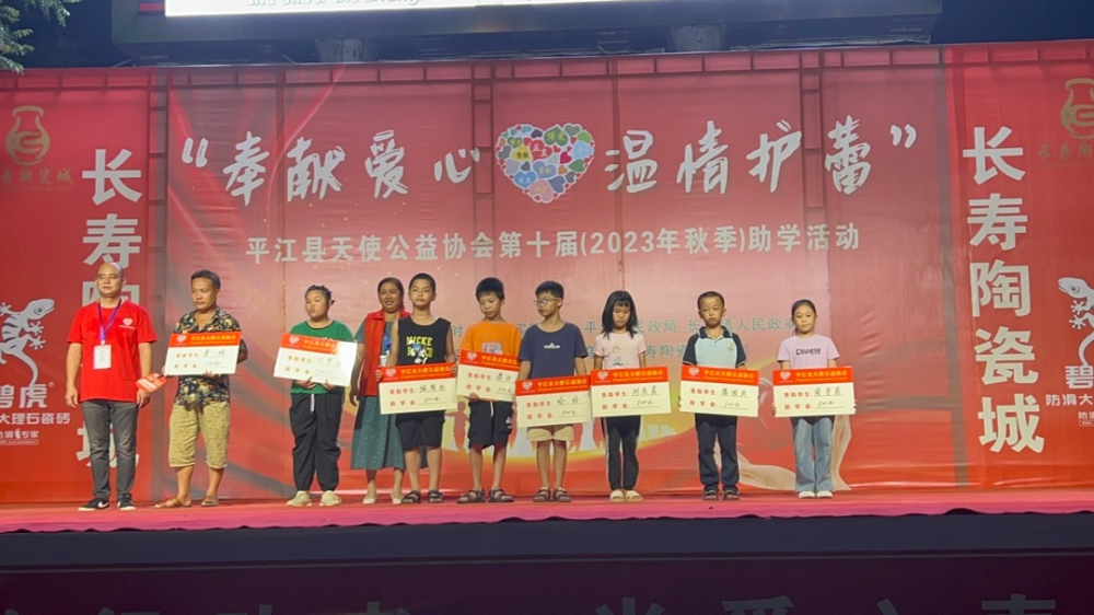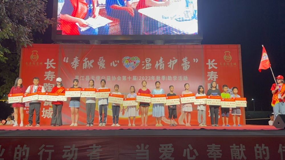 8月20日晚,长寿镇金河广场人声鼎沸、热火朝天,上千名群众聚集在这里,共同参加长寿镇“奉献爱心·温情护蕾”暨平江县天使公益协会第十届(2023年秋季)助学活动。此次活动由平江县新时代文明实践中心、平江县民政局、长寿镇人民政府指导,平江县天使公益协会主办。