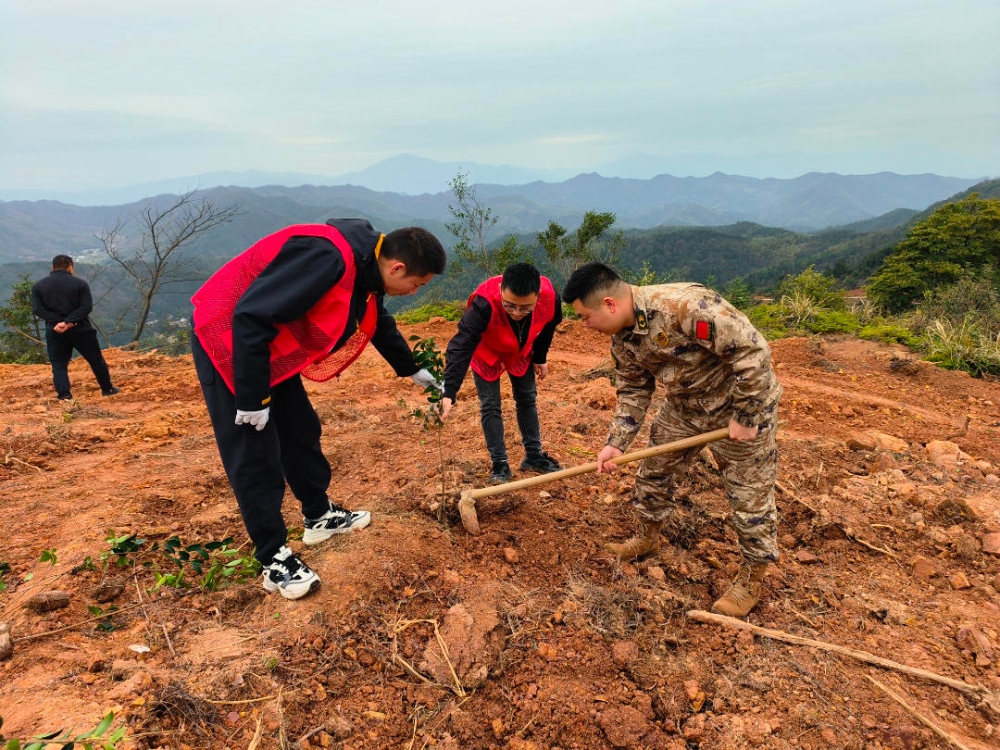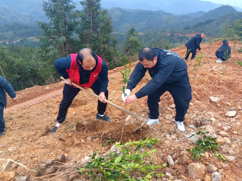 活动现场,大家分工协作、动作熟练、配合默契,有的挥锹铲土、有的扶正树苗、有的提水浇灌,现场呈现一片热火朝天的劳动景象。经过大家的通力合作,原本空旷的土地上一棵棵油茶树矗立在山头,嫩绿的枝芽显得格外清新,传递着春日的生机与活力。经统计,本次活动共计栽种油茶树苗2000余棵。