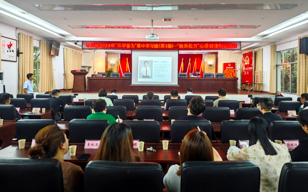 5月22日,岑川镇举办2024年“乐学善为”集中学习班(第3期),全体党政班子成员、镇机关干部以及村(社区)两委干部共60余人参加。此次学习班特邀县精神卫生中心主任医师赖高平,以“快乐处方”为主题,上了一堂生动有趣的心理健康知识讲座。