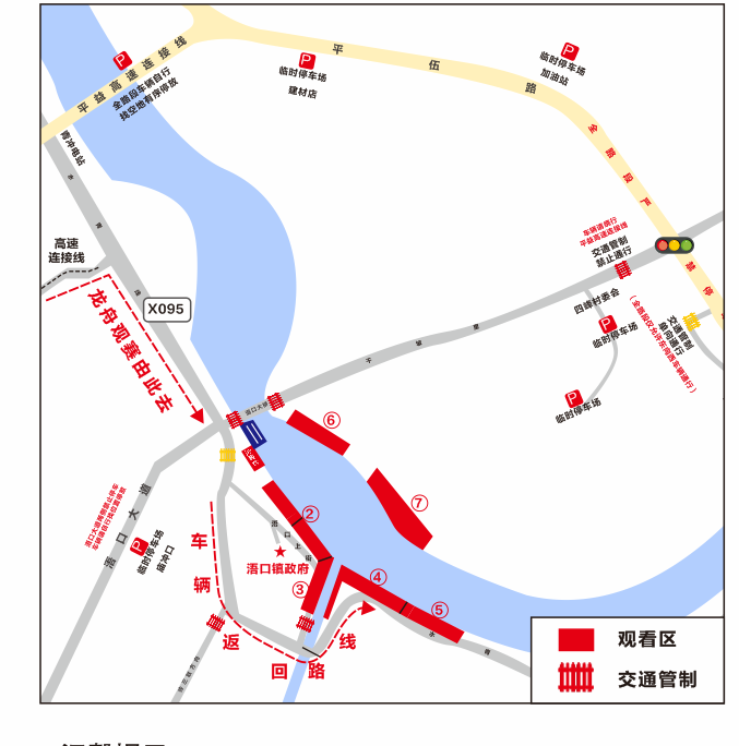 请通行车辆按照交通管控方案绕行,观赛群众车辆按照交通管控方案听从现场工作人员指导有序停放,前往6、7观赛区由平伍公路四峰路口进入,前往2至5观赛区由平益高速路口及老平伍路进入,中途需撤出的在现场工作人员指导下有序返回,赛事结束后按原路有序返回,感谢大家的支持与配合。