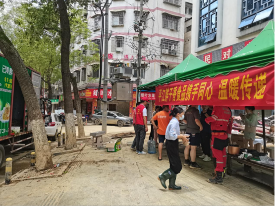 “真好,饭菜还热乎着,这扣肉味道真不赖。”多名一线救灾人员接过胖子香食品送达的爱心餐,津津有味地吃着,听说这是爱心企业公益送餐,好多人竖起了大拇指为胖子香点赞。