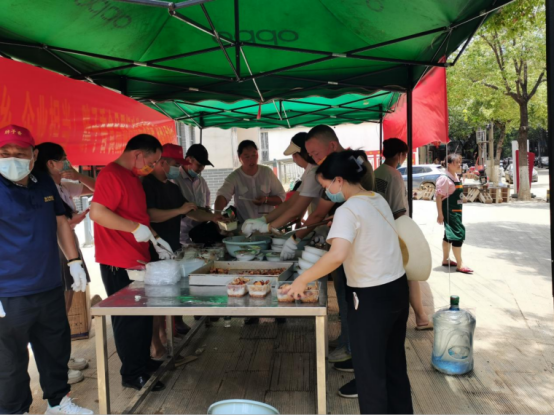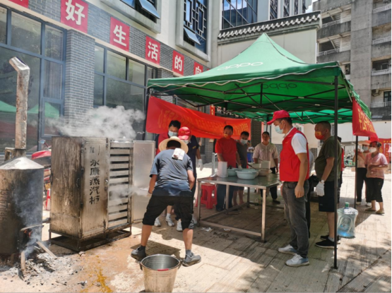 为了让一线抢险救援人员吃上热乎的饭菜,7月6日,平江县胖子香食品有限公司自带材料设备,在汉昌街道办事处前坪支起了伙房,为无私付出的英雄们送去爱心餐。