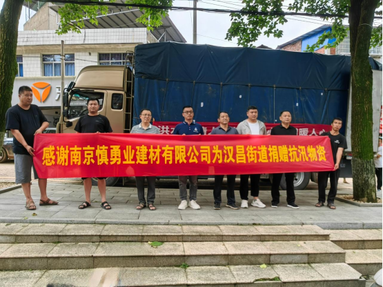 7月3日,南京慎勇业建材有限公司连夜采购,向街道捐赠了价值人民币12.8万元的赈灾物资,包括1500箱方便面、1200瓶油和1400袋大米等急需物资,用于救灾一线应急以及灾后重建工作。
