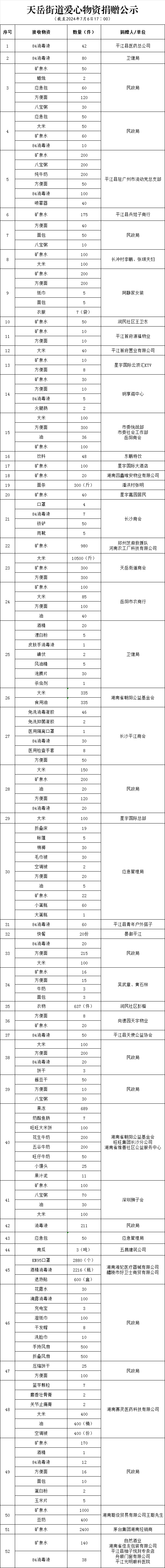 据统计,截至2024年7月6日17点,天岳街道接收爱心捐款共计146.9606万元、爱心捐物若干。现将2024年6月30日至7月6日接收捐赠情况(第一期)公示如下: