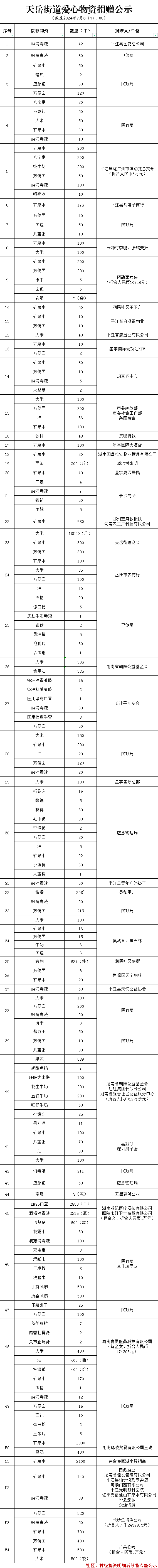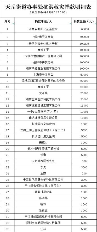 现将截止2024年7月8日17点,天岳街道接收捐赠情况公示如下: