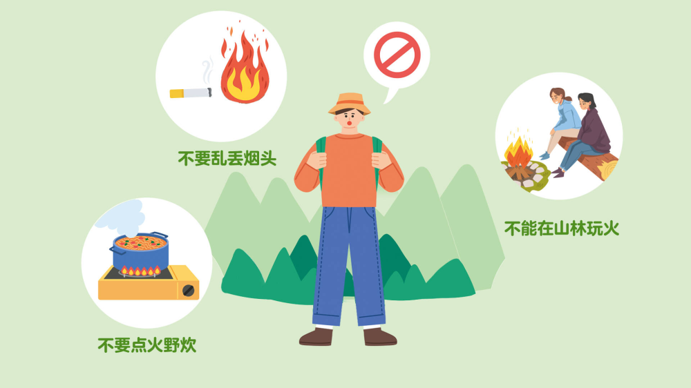 1.森林防火牢记“十不准”:①不准携带火种进山;②不准在野外烧火取暖;③不准在林区吸烟、用火把照明;④不准在林区野炊、烧烤;⑤不准在林区内上香、烧纸、燃放烟花爆竹;⑥不准炼山、烧荒、烧田埂草、堆烧等;⑦不准让特殊人群和未成年人在林区内玩火;⑧不准乘车时向外扔烟头;⑨不准在林区内狩猎、放火驱兽;⑩不准让老、幼、弱、病、残者参加扑火抢险。