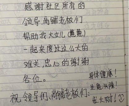 “今日我当班+”的当班人苏咯华当天在社区听到这个消息,马不停蹄四处打听详细情况,提议开展献爱心捐款活动,帮助小惠惠一家渡过难关。在苏咯华和社区干部的发动下,爱心的火种迅速点燃整个社区,附近居民纷纷响应,面馆老板、五金店老板、广告店和快递店等商家也踊跃捐款。
