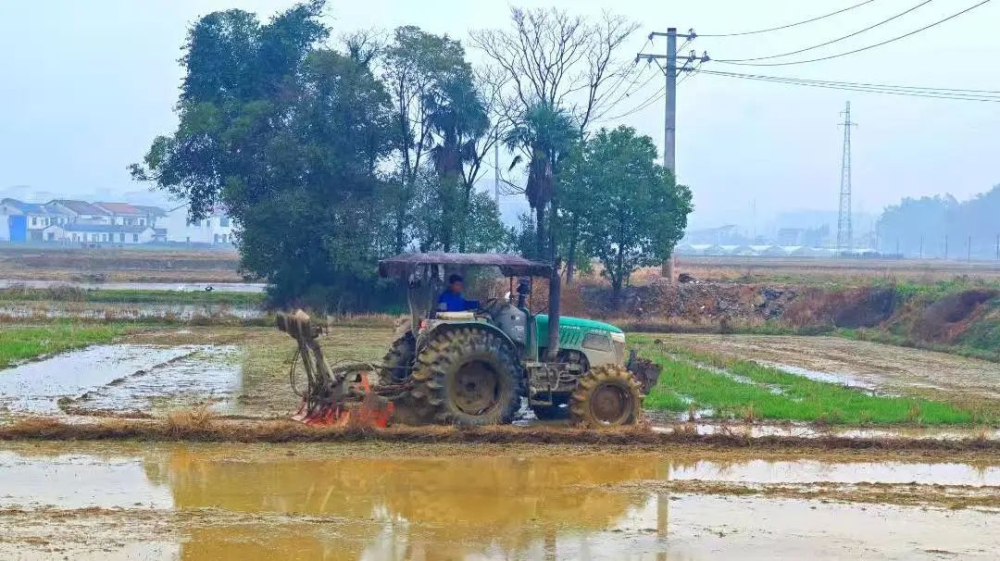 一年好景看春忙。走进大义村的水稻种植地,机械轰鸣声响彻现场。在平整的田地里,农机手正在加足马力,驾驶农机在田间耕翻平整农田,为播种水稻育秧和插秧提前做准备。