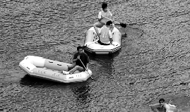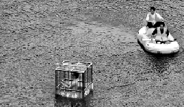 关在笼子里的魔术师被抛下湖面。