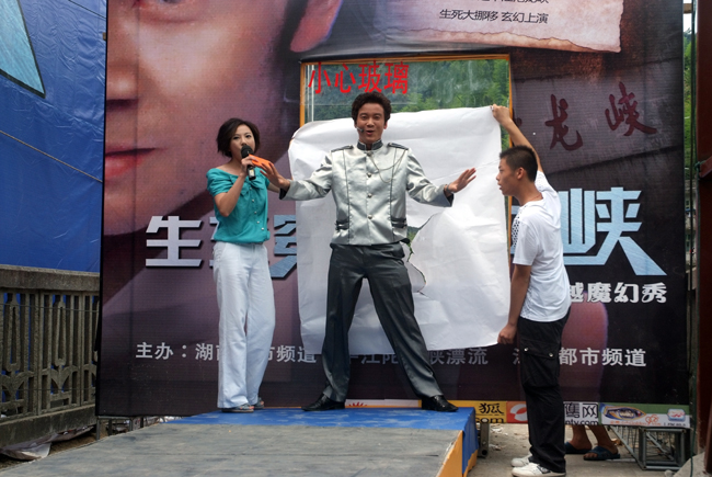 2009年6月28日,一个让人惊心动魄的日子,中国大陆新锐派魔幻高手杨雨辰在平江沱龙峡景区首推大型真人穿越魔幻秀“生死穿越沱龙峡” ,向国际顶尖魔术师丹尼尔斯的经典魔术“穿越美国大峡谷”发起挑战。杨雨辰将一位带着一件不可复制信物的美女当众锁进一个箱子,用绳子捆住箱子并放置在沱龙峡大坝龙湖上方。在千万观众眼前把绳子烧断使箱子从五十米高空抛进沱龙峡大坝上方的龙湖。让观众惊奇的是一阵烟雾之中,美女穿越了这座宽十米、高五十米的钢筋混凝土大坝,出现在大坝下方一座水上孤岛的中央,此时美女手上仍拿着那件不可复制的信物。转瞬之间实现百米大挪移,究竟是魔术师的障眼法还是依赖了物体运输的高科技?这一切都令人叹为观止!数千游客要杨雨辰揭秘,但魔术的魅力就在于,秘密只属于魔术师。活动主办方湖南都市频道称杨雨辰之所以选择在沱龙峡景区表演“生死穿越沱龙峡”,是因为沱龙峡比美国大峡谷更为险峻,对魔术师来说是对自己极限的一次挑战。如此大规模的景区为何以前一直默默无闻呢?许多游客对此深为不解,那么让我们来解密沱龙峡。