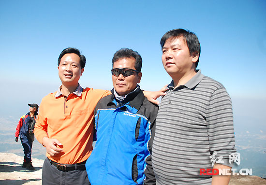 来自韩国的滑翔伞运动员吴美焕(中)与平江县副县长李镇江(左)在起飞点合影留念。