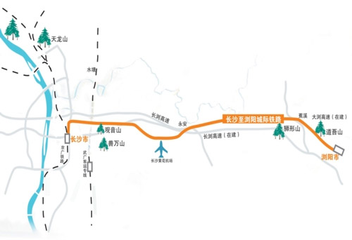 由长沙火车站北端引出后跨浏阳河折向东,跨东二环、万家丽北路、京珠高速、武广高铁浏阳河隧道后,沿星沙盼盼路向东至黄花国际机场,出机场站后向东北上跨长浏高速公路,在长浏高速公路北侧一路向东,经永安镇、浏阳工业新城、蕉溪乡后折向南,进入浏阳市区。