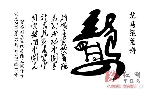 作品在原创作“湘作登字18-2013-F-699,18-2013-F-1174”的基础上再创作了这个“龙马抱兔寿”寿字。此寿字传承了康熙御笔“福”字及开国领袖毛主席书法“寿”字书法笔韵,富有康熙皇帝和毛主席书法名家文化;创新添加了“龙马抱兔、天人合一”的新创意,由“龙、马、兔、人、天、一、九、多、分、寿”10字组合而成,其中“兔”字源于甲骨文“兔”字并按玉兔外型作了6个轮子,寓意泱泱中华“嫦娥玉兔软着陆,马到成功中国梦;龙马抱兔寿寰宇,月宫盛开中国花”。