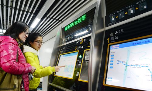 12月19日,两位市民在长沙地铁2号线杜花路站,体验通过自动售票机购买地铁票。本报记者 徐行 摄