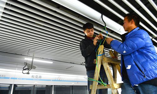 12月19日,施工人员在长沙地铁2号线杜花路站安装照明顶灯。本报记者 徐行 摄