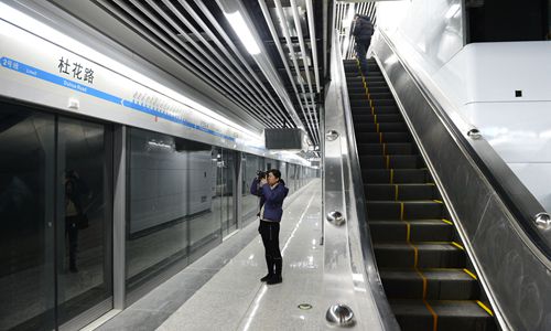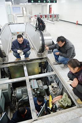 12月19日,技术人员在长沙地铁2号线杜花路站安装调试自动扶梯。本报记者 徐行 摄