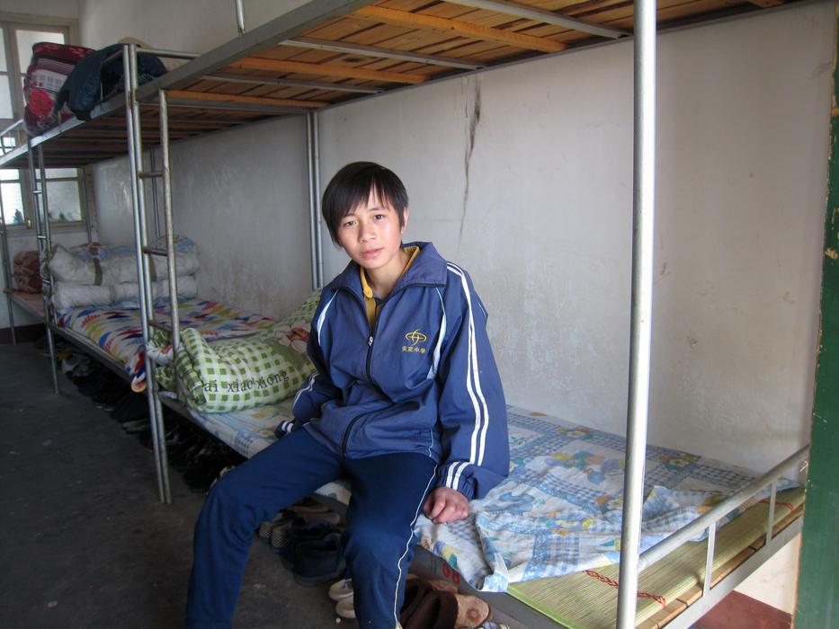 不知是年久失修,还是老鼠作梗,阳光能从屋顶碗口大的洞中照射到房子里。忠国的睡房里,发霉的纸浆板天顶无力的耷拉着,墙壁上满是雨水冲刷的泥痕,木质窗户已无法关合,窗玻璃也不知何时被打碎,屋里靠门的地方摆放着一张学校提供给他做作业用的课桌。靠墙有两张床,一张放着两个破旧的箱子,上面搭着一些旧衣服,这大概就是他唯一的家具了;另一张是用两把条凳架起来的,床上只有被单和薄薄的棉被,这大概就是他睡的床铺。