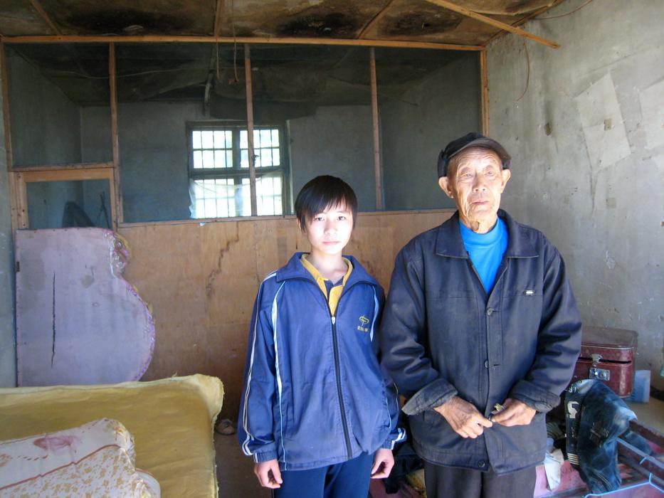 这是平江大山脚下的一幢农舍,红砖墙,青瓦顶。经过一天日晒的山村,尽管初霜已醒,却还是有些寒意。房子前的地坪上落叶飘零,野草枯黄,不知是谁在窗前凌乱地堆放着一些稻草和农具。屋后的残垣断壁从一人多高的灌木丛中伸出,似乎在诉说着这个家庭的凄惨。这就是14岁的陈忠国的家。班主任陈老师告诉我,学生花名册上家长姓名写的是“陈爱国”。