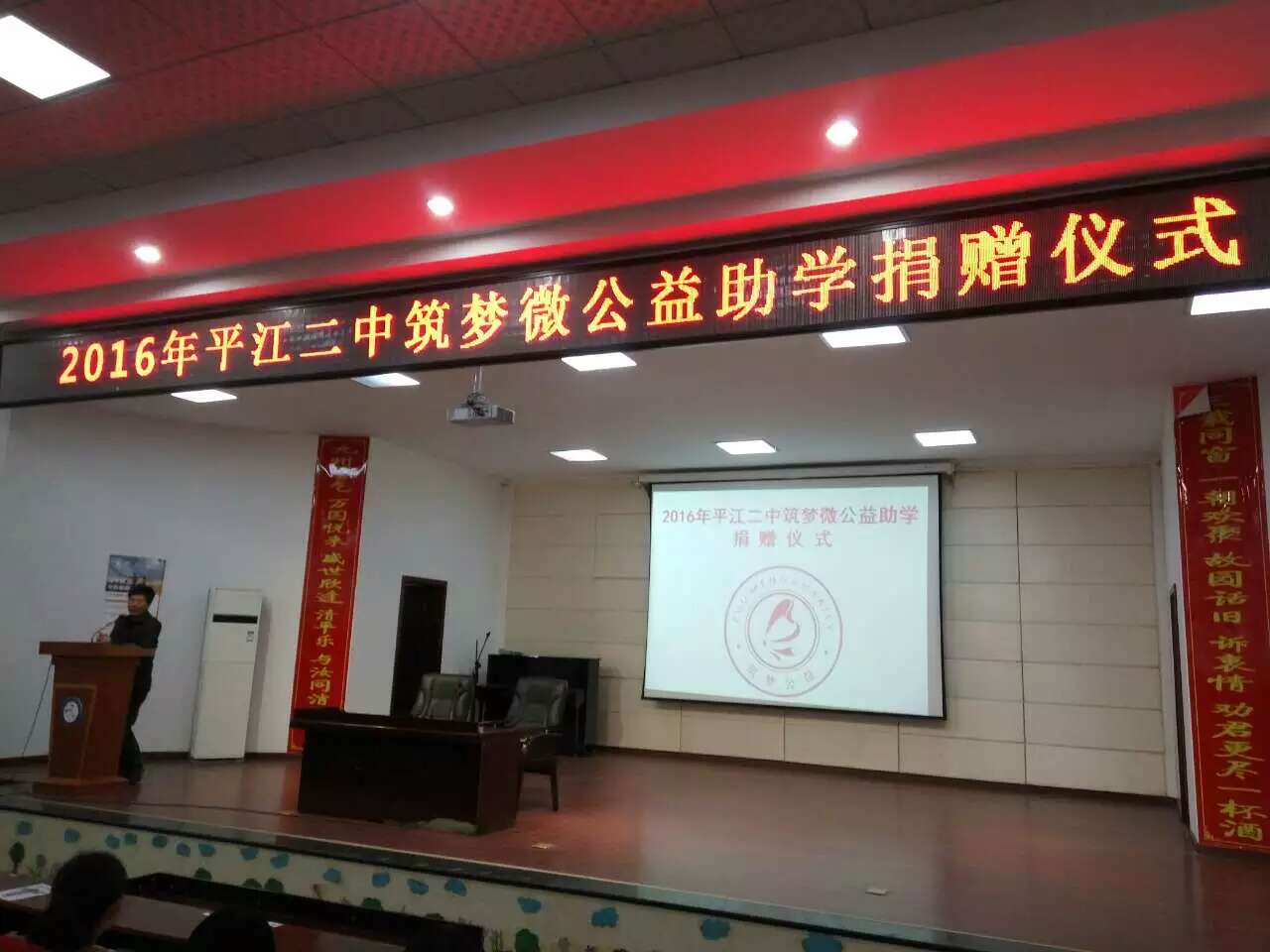 2016年3月8日中午,平江二中“筑梦微公益”助学捐赠仪式在平江县第二中学报告厅举行。平江二中校长单威雄、团委书记李冰及二中“筑梦微公益”志愿者代表李三元、唐飞雄、黄湘等参加本次活动。