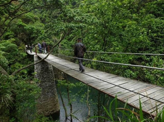 五月的芦头林场如歌豪迈奔放,被雨水洗过的林木格外好看,福寿溪水润润的新绿夹着层层薄雾,两侧悬崖遍布奇藤古树,千姿百态的枝干、树叶、藤蔓缠绕形成一条巨大的绿色帷幕。林木中的水蒸气在光合作用下形成庞大的“天然氧吧”,各种植物的精气不断地分泌挥发,只要做一个深呼吸,郁闷的五脏六腑旋即鲜活起来。一群爱美的女大学生在丽峰峡谷的钢索桥上裙袂飞扬,翩然地走在峡谷林中的思绪里,酝酿成一道靓丽风景。在钢索桥上观望溪中有潭,潭中映山,只见指导老师和实习的大学生,坐在潭边不时喝一捧清泉。林场工会主席向建平告诉我们:山中海拔相差1000米以上,森林植物群落演替严重,分为人工针叶、阔叶林、针阔混交林、竹林、灌木林等12个植被群系。形成了人工林,天然针阔次生林和楠竹林并存的局面。林场生物多样性丰富,珍稀濒危保护和地方特色植物种类繁多。天地间琼楼仙阁听你指令,河床的波光摇晃倒影荡漾,我们随向主席一路穿林渡水,赏石玩藤,犹入人间仙境。