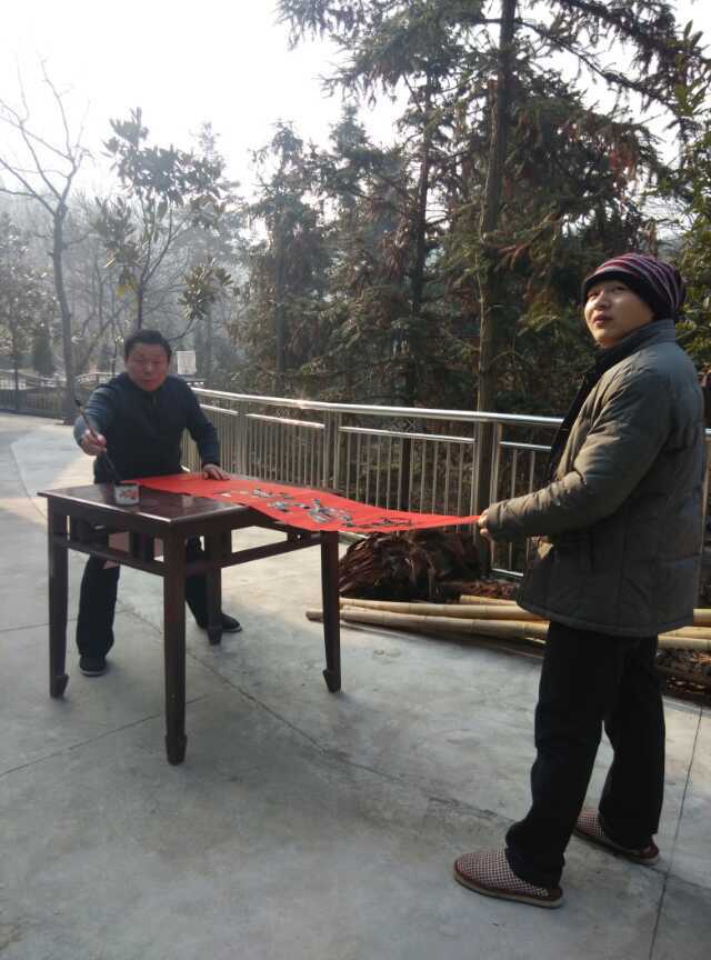 曾驰龙老师正在八仙桌上帮人写对联
