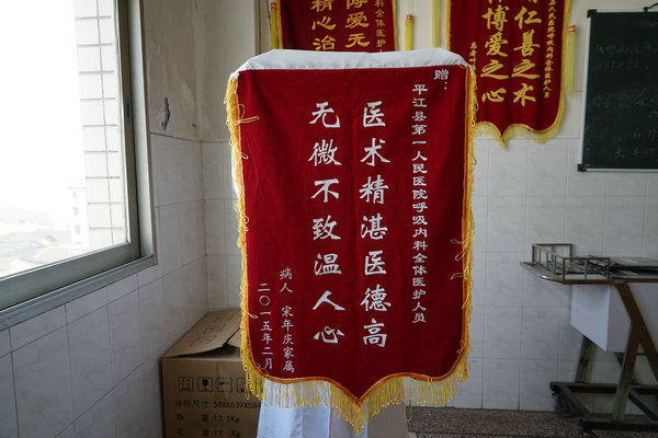 宋爷爷已经去世了,但他的家属仍将一面锦旗送了过来。“医术精湛医德高 无微不至温人心”。字字贴心,句句温暖。家属说过这样一句话,让人印象深刻,“送这面锦旗还有一层意义,现在有的病人家属不理解你们,我们就是要用行动来证明,我爸虽说已经去世,但我们深知,你们是医生,并不是神仙,理应得到全社会的人理解和尊重。我们深深地感谢呼吸内科的全体医护人员对我爸爸的精心诊治与细心护理”。