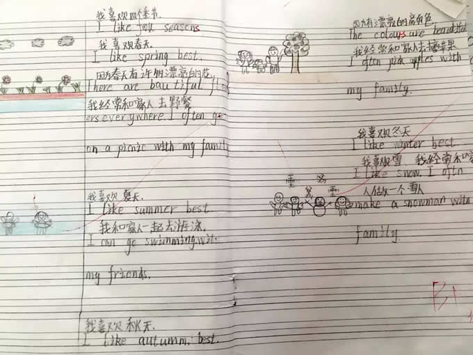 “用英语描述自己眼中的四季,并根据自己的想法画一画……”这是上周五付老师老师给孩子们布置的别致的“写绘作业”:除了需要动手写一写英语句子,还要画一画。作业布置之后就引起了一场不小的“轰动”,孩子们都说“这个作业我喜欢,我要好好做!”