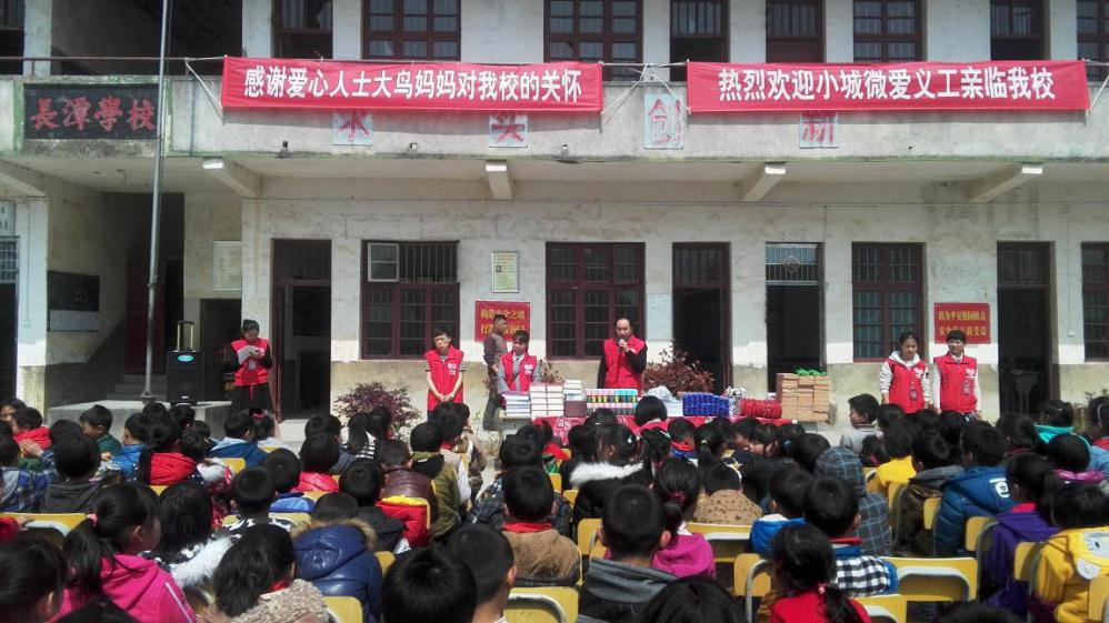 3月25日下午,春光明媚,花香四溢。位于平江县南江镇幕阜山脚下的长潭小学,共计200余名师生高兴地迎来了十几位身着“小城微爱”红色马甲的义工,一场由北京爱心人士网名“大鸟妈妈”捐赠的总价值逾八千元的爱心礼物发放仪式在该校“孝心球场”如期举行。