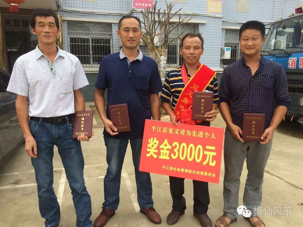 9月6日,全县见义勇为先进个人表彰会在县影剧院如期召开。这天,梅仙镇凤形村塘坡组的四位“义士”陈盟义、陈自平、陈岱辉、陈太山踏上了全县表彰大会的舞台,接受了属于他们的荣誉和满堂的掌声。