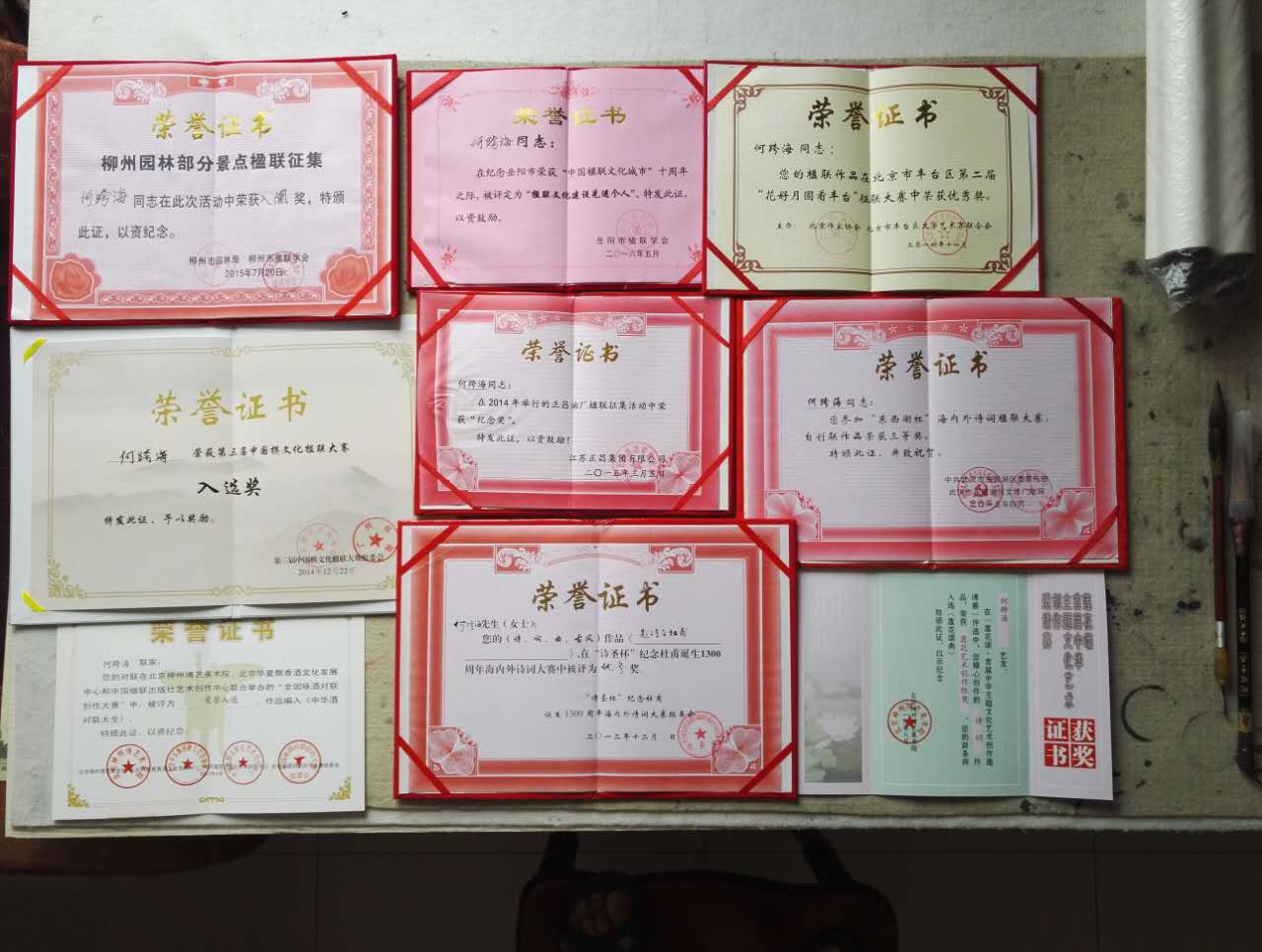 走过冬的冰霜雨雪,踏过春的耕耘播种,守过夏的长夜漫漫,终于迎来了秋的硕果累累。暂且罗列一下有关何老师近几年来荣获的各类奖项,以飨读者。《题家居》:小楼幽径绕香风,青草阶前、红花窗外;寒舍疏篱凝晓色,白云山上、淡月庭中。(获《第二届百诗百联》大赛优秀奖);月儿湾民俗风情园甲午春联:春风作笔,锦绣描成风俗画;明月流光,辉煌铸就月儿湾。(获甲午春联大赛优秀奖);《题南江抗日英雄纪念碑》:抗日英魂何所之,露江山上立丰碑。红花有序妆春色,白鸟无名落素枝。七十年轮秋夜月,三千壮士李陵诗。清风翻过芳声远,流水潺然万古悲。(刊《湖南诗词》2015年第3期,获中华幕阜山杯全国诗词联大赛三等奖,刻露江山抗日英雄纪念园;《春日感怀》:二月乡村绿并红,江山妆点自然功。芭蕉叶上三更雨,蛙鼓声中一夜风。莺懒燕忙穿柳线,蜂飞蝶舞戏花丛。人间竟有真滋味,只恨春光逝太匆。(2011炎黄杯诗词大赛一等奖);《题忠孝殿》:问堂上曾公,何能玉振金声,渊源至远?看人间诸事,安得敦仁雍睦,孝字当先。(获河南省方城县“中华曾氏祖根地”全国征联二等奖);《题白水洞》:半天开眼界,赏花香在野,鸟语鸣林,漱石有佳音,流淌山溪皆白水;一洞豁心胸,任竹影投身,松涛洗耳,入怀无俗气,归来步履带仙风。(获新邵县白水洞风景名胜区全国诗联有奖征稿二等奖);《题诗圣杜甫》:江湖漂泊证行藏,时事关心入锦肠。记录民生欣有笔,匡扶社稷恨无方。辞官省察寒门苦,扶病谙知老树苍。一自高山冥漠后,谁人来道世间凉。(纪念杜甫诞生1300周年“诗圣杯”海内外诗词大赛优秀奖)。