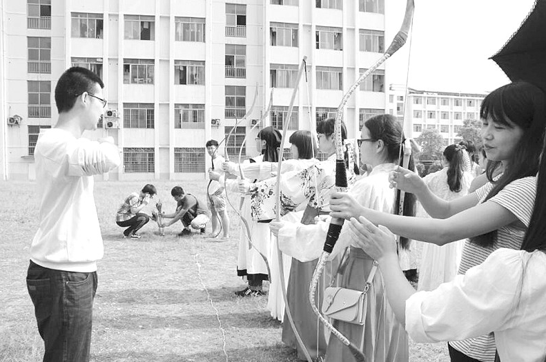 在湖南理工学院有这样一个社团:每逢周末,社员们会自发穿着汉服盛装来到学校的操场练习古典射礼,诵读国学经典。他们将社团取名为“巴陵汉风文化社”。