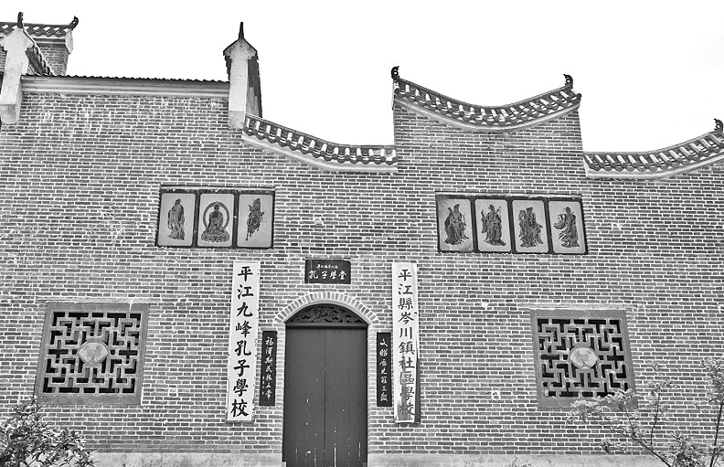 九峰村绝大多数村民姓黄,孔子学校设立在村里的黄氏宗祠中。据悉,黄氏宗祠是乾隆御师、翰林院一级检讨黄秀字道山所修,多年来一直是村里教书育人的场所。1972年,九峰黄氏宗祠因修水库被淹拆。2007年以后,为进一步弘扬孝道和民族文化,族人决心以先人为榜样,黄氏族人在黄俸仁老人的牵头下,自筹经费,开始复修宗祠。