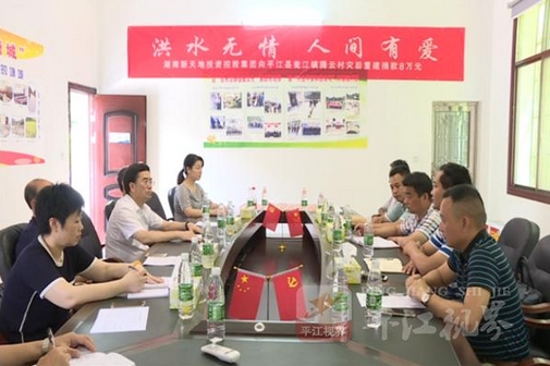 7月18日,湖南新天地投资控股集团组织工作人员来到瓮江镇腾云村,捐赠八万元爱心款支援该村的灾后重建工作。