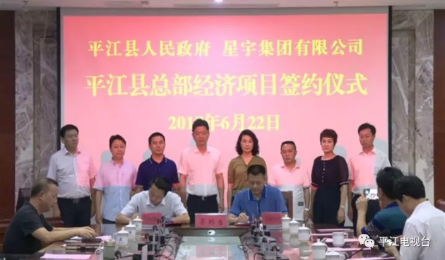 6月22日,平江县人民政府与湖南星宇集团有限公司总部经济基地项目签约仪式举行。县委副书记、县长黄伟雄,湖南星宇集团有限公司董事长李正东分别代表平江县人民政府、星宇集团进行项目签约。县领导陈淼、魏移宗、刘佑泉等出席签约仪式。